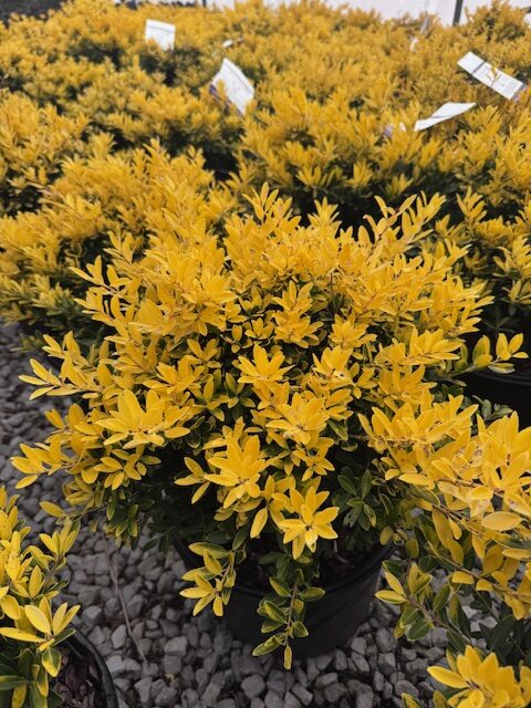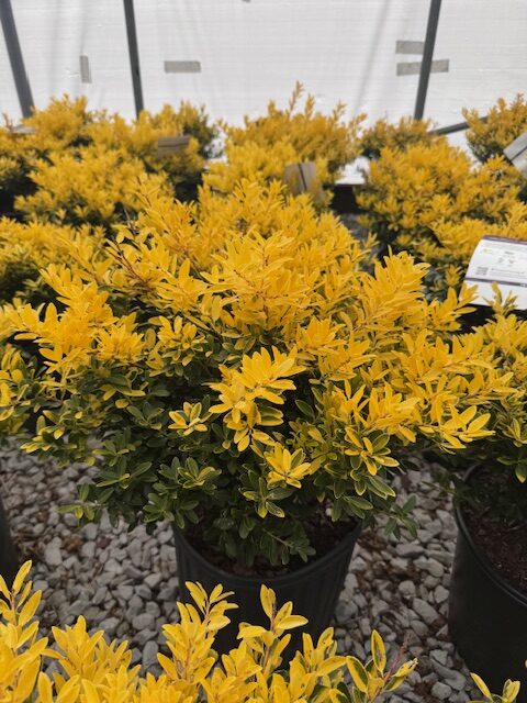 The Golden Hoogendorn Holly has brilliant golden-yellow leaves that emerge in spring. The Golden Hoogendorn Holly is a low-growing, dense evergreen shrub with small rounded leaves and good cold-hardiness. The golden color fades in shade and during summer. Mature size is 3 to 4 feet tall and 4 to 5 feet wide.